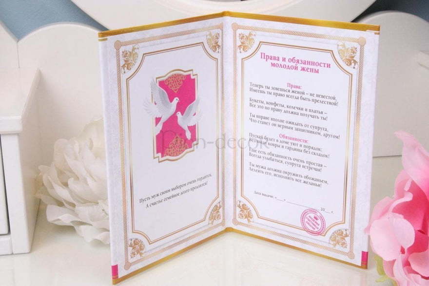Права и обязанности молодой жены В избранное Права и обязанности молодой жены — повысят энтузиазм и сильно улучшат реализацию оригинального пира. Высота 16,5 см. Ширина 11 см. Тип аксессуаров для Традиций и Конкурсов Все для конкурсов Показать полностью